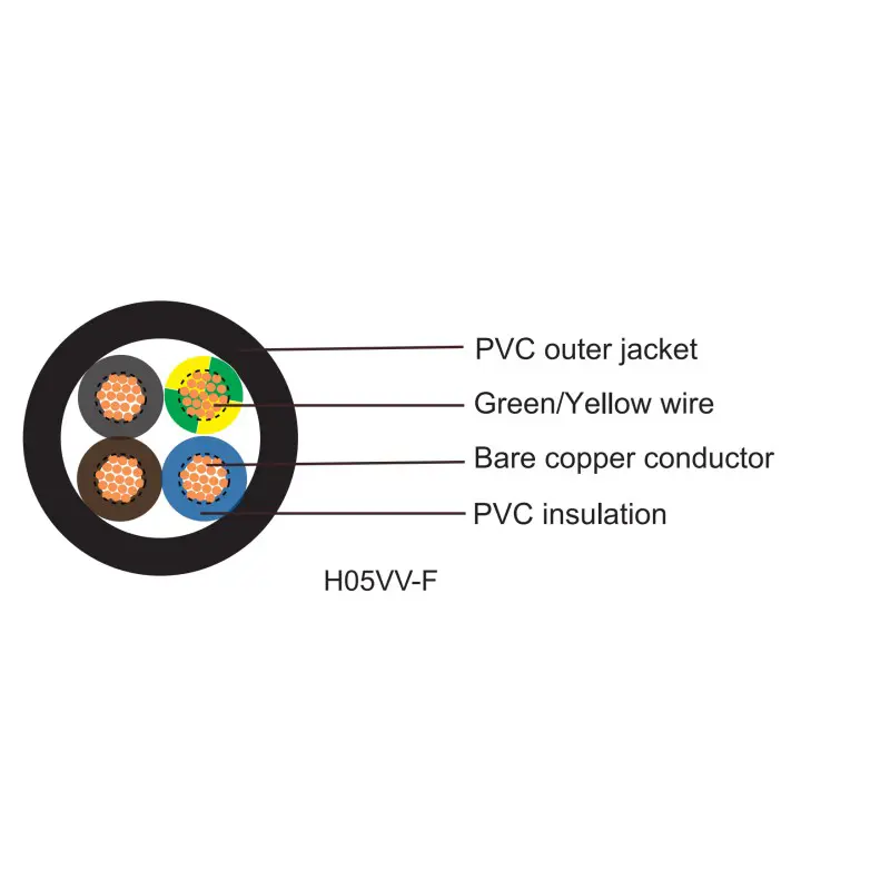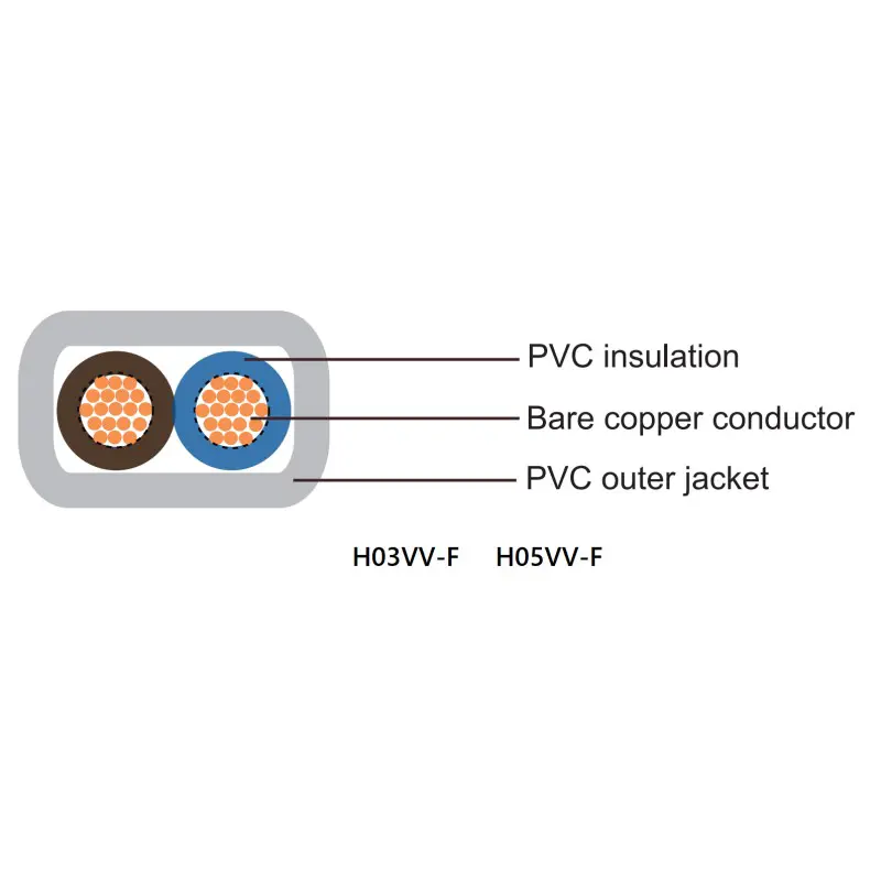 H05VV-F, H05VVH2-F, H03VV-F, H03VVH2-F está compuesto por conductores de cobre fino Clase 5, aislamiento y funda de PVC sin plomo.
